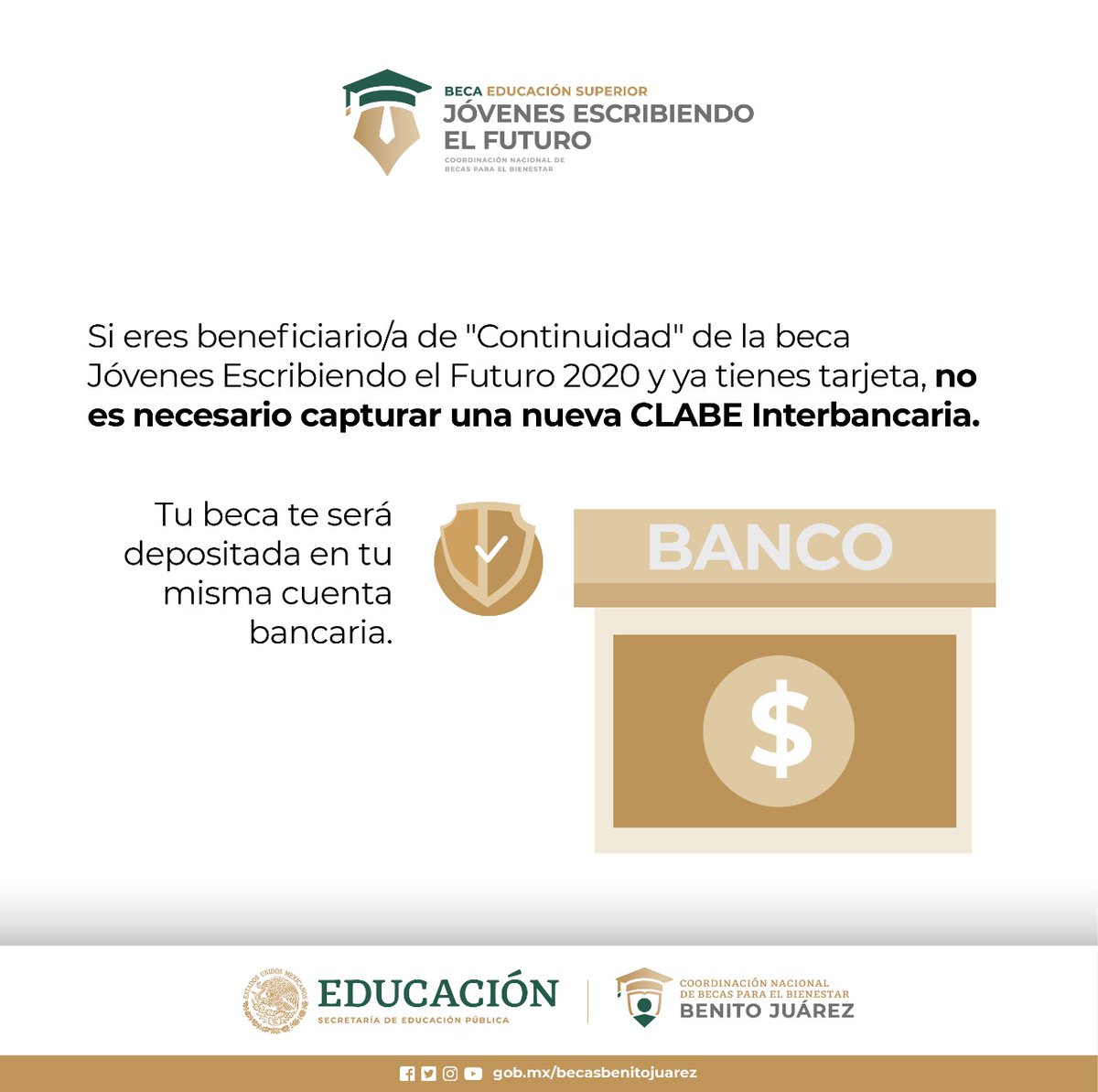 Las fechas y los requisitos. Si estuviste becado por el programa jóvenes escribiendo el futuro y recibiste el apoyo económico en el bimestre de pago anterior inmediato a la publicación de la convocatoria en turno se entiende que eres becario de continuidad es decir para ser considerado como becario de continuidad en la próxima convocatoria debiste haber recibido. Jóvenes escribiendo el futuro registro subes 2020 será del 7 de septiembre al 4 de octubre.