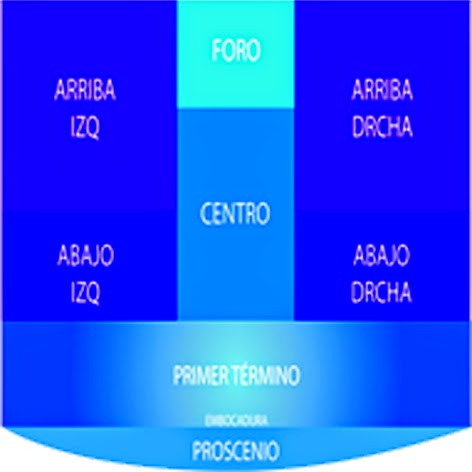 La americana que funciona de manera horizontal y la guillotina que funciona de manera vertical. Es el terreno visible del escenario donde los actores realizan su rutina teatral. 2 concha de apuntador. El escenario suele dividirse entre el proscenio primer o segundo plano y foro de ahí la expresión mutis por el foro que significa sale por el fondo del escenario aunque en grecia tenía el nombre de éxodo.