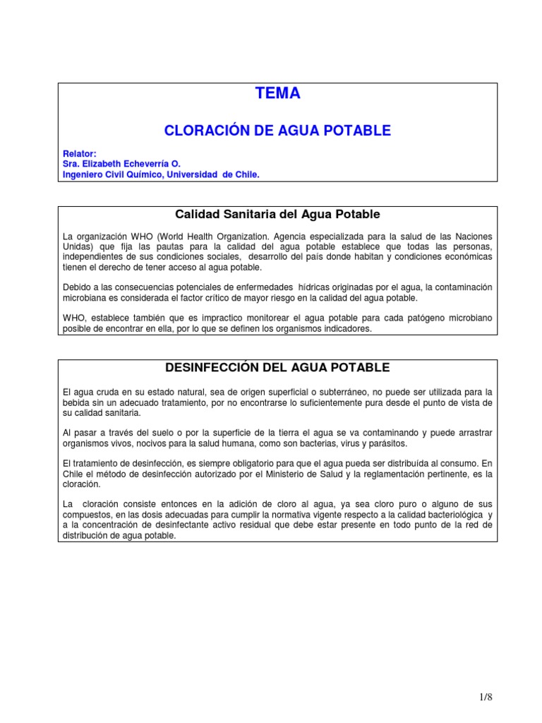 En que consiste la cloracion del agua. Del 2 7 restante aproximadamente el 2 1 se halla en los casquetes polares y en glaciares y sólo el 0 61 es agua dulce líquida. Cloración la cloración es el procedimiento más extendido en la desinfección de aguas de consumo en razón a que el cloro reúne la mayoría de las propiedades del desinfectante ideal. La cloración se emplea en las partes finales de los tratamientos de potabilización desalación incluso depuración. Qué es la cloración del agua.